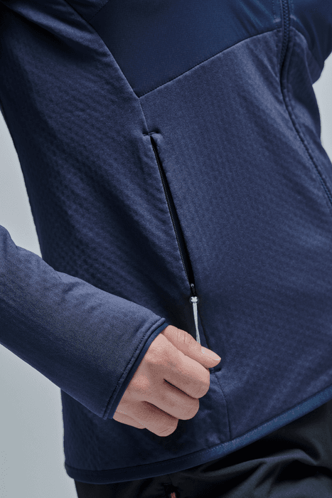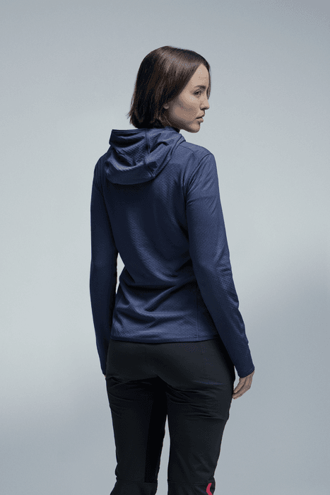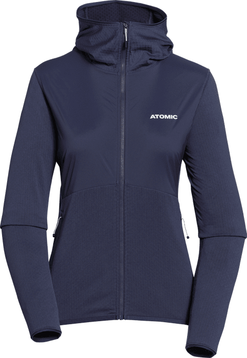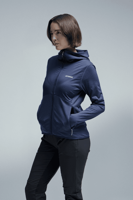La sudadera con capucha Atomic Backland Tech W es una capa intermedia de polar que se puede usar dentro o fuera de la montaña para una capa versátil y elástica.